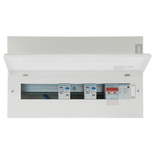 Hager VML910CURKPP Design 10 high integrity pre-populated consumer unit, 10-way fuse box includes 100A DP main switch, 2x 100A Type A RCDs, 8x MCB'...