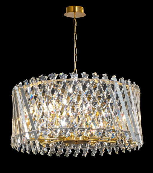Criss Gold Crystal Chandelier 10 Light SPECIFICATIONS: Finish: Gold Diameter: 60cm Min-Height: 40cm Max-Height: 200cm Wattage Per Bulb: 10xE14 Dimm...