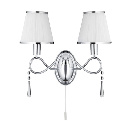 This Simplicity Chrome 2 Light Wall Bracket with Glass Drops and White String Shades is classic and modern. Two decorative hoops finished in chrome...