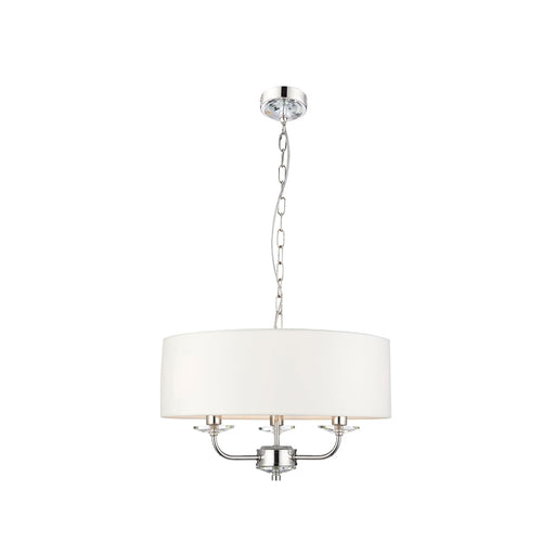 The Nixon 3 light ceiling pendant is finished in a bright nickel plate. The 3 arms are complimented with a touch of crystal and the fitting is topp...