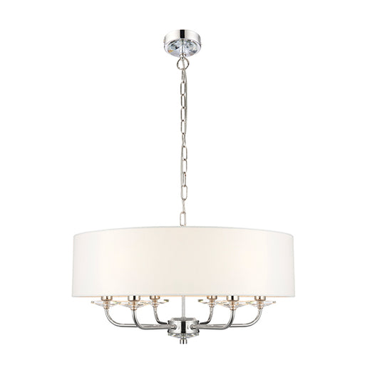 The Nixon 6 light ceiling pendant is finished in a bright nickel plate. The arms are complimented with a touch of crystal and the fitting is topped...