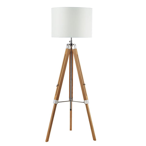The height adjustable tripod base of the Floor Lamp base is finished in light wood with polished chrome trim. Floor lamp is foot switched. Shown ...