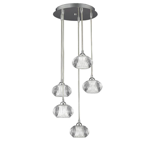 5 light Multi Light Pendant in chrome finish with clear cables holding ripple effect glasses. The length of the cables can be shortened on-site if ...