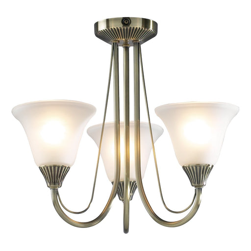 This 3 Light Semi Flush Light features opaque glass shades and antique brass frame.Additional InformationHeight: 33cmDiameter: 52cmFinish: Antique ...