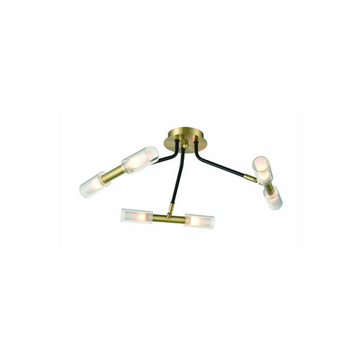 5 light Semi Flush Light in brushed satin gold and black with a decorative glass at the base of the satin gold tube. Additional Information Min-Hei...