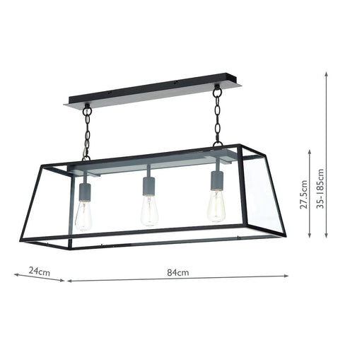 Perfect for use over kitchen islands or dining room tables, this 3 light box Pendant has a matt black ceiling plate and frame with clear glass pane...