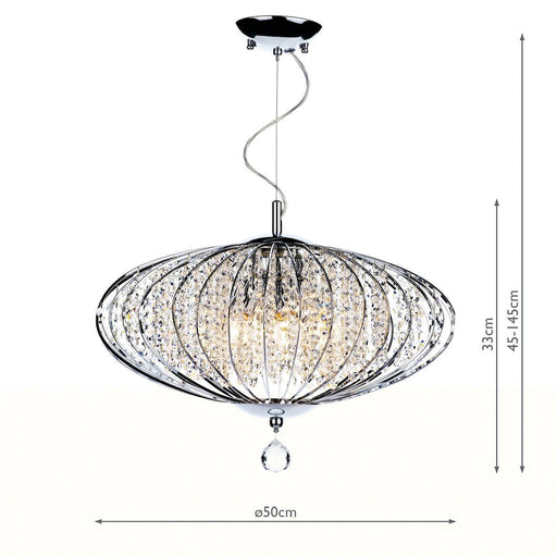 This 5 light Pendant features myriad crystal glass beads and drops encased within a polished chrome oval frame and is finished with a large, centra...