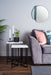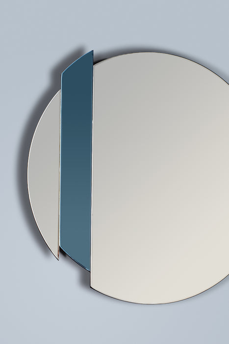 A round mirror intersected by a single strip of smoked finish glass. Part of a family of three mirrors; see also 002JON50 and 002THA50.