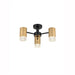 3 light Semi Flush Light in brushed satin gold and black with a decorative glass at the base of the satin gold tube.