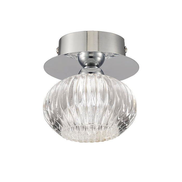 Flush Ceiling fitting in chrome finish with a ripple effect glass. Suitable for dimming if used with mains voltage halogen lamps. LED G9 lamps may be used but suitability for dimming will depend on the lamp and switch used.