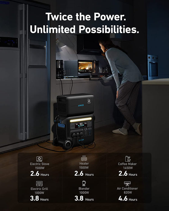 Double the Power: Use 760 Expansion Battery (2048Wh) with Anker PowerHouse 767 (2048Wh) and scale up the battery capacity to 4096Wh.