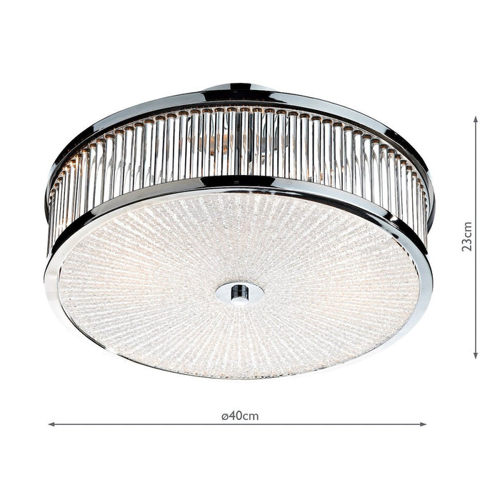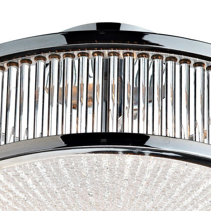 This 3 light Flush fitting features a patterned glass diffuser and glass rod decoration to side.
