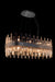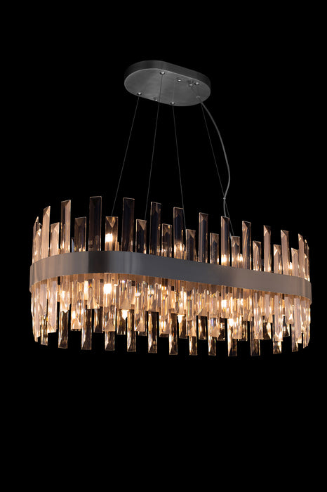 A contemporary suspended oval chandelier with a matt silver band. Simply slot the clear glass into the frame for a stunning feature over your dining table or kitchen island. The light reflects beautifully through the glass pieces.