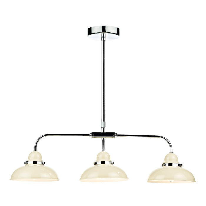 This 3 Light Pendant features a polished chrome ceiling plate and a metal retro-styled shades in cream. This pendant is fully height adjustable at point of installation.