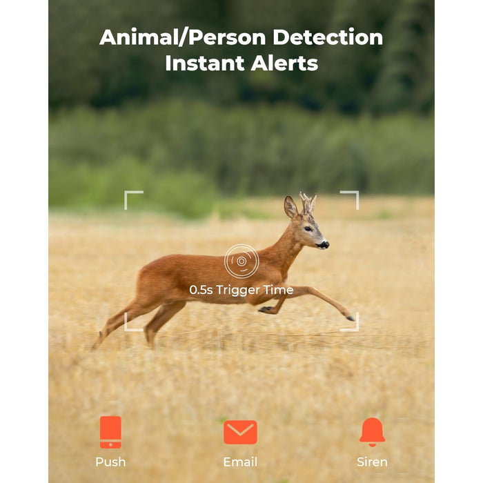 The Reolink Ranger 4G LTE 2K 4MP Super HD Pan & Tilt 100% Wireless Trail Camera includes an eco-friendly solar panel for constant charging. The advanced AI Animals & Person Detection and an Invisible IR LED for Night Vision provides 24/7 clarity and more accurate alerts via your Reolink App. Two-way audio built-in you can communicate and/or deter any suspicious activity. Includes 64GB MicroSD Card for extended recording ability.
