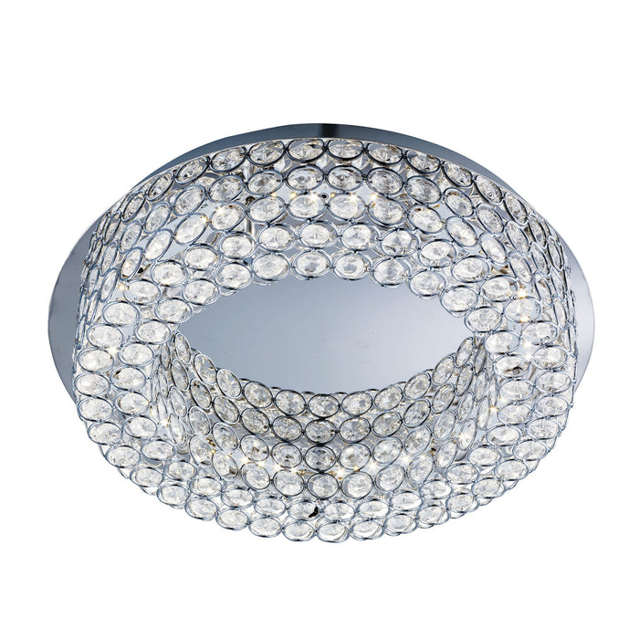 This Vesta 54 Integrated LED Flush Light with clear crystal buttons looks modern and magnificent on any bedroom living room dining room or kitchen ceiling. The circular chrome finish ceiling plate has a halo of decorative crystal buttons which are held in place with miniature chrome hoops. The energy saving Integrated LED lights make the whole fitting sparkle and shine to perfection creating a graceful lighting effect.