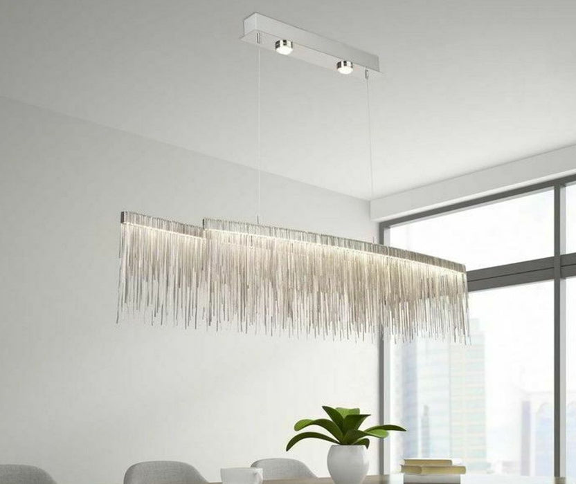Add the ultimate glamorous touch to your home with this eye catching chain link waterfall fitting. The shimmering satin silver waterfall detail suspends from a sleek chrome ceiling bar. When lit, a beautiful sparkling effect is created that will look dazzling suspending from your hallway or living room ceiling. LEDs use up to 85% less energy and last up to 20 times longer than incandescent bulbs.